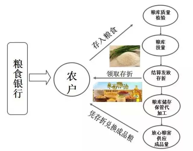 農(nóng)民打下新糧,存入企業(yè)提供的糧倉(cāng),定期或活期自由選擇,并且享有利息,這個(gè)糧倉(cāng)就作為“糧食銀行”為農(nóng)戶提供代存代儲(chǔ)代加工糧食等服務(wù),糧食銀行會(huì)給農(nóng)戶發(fā)放 “糧食存折”,記錄著存糧日期、數(shù)量、取兌日期和余額等信息。農(nóng)戶還可憑存折在鄉(xiāng)村各個(gè)網(wǎng)點(diǎn)兌換米、油或化肥、種子、農(nóng)藥等各種農(nóng)資。農(nóng)戶走進(jìn)糧食銀行,就好像走進(jìn)了商業(yè)銀行的儲(chǔ)蓄所,只不過存取的內(nèi)容從現(xiàn)金變成了糧食。