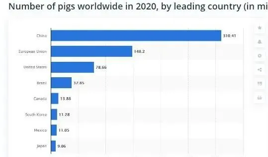 根據(jù)STATISTA數(shù)據(jù)公布統(tǒng)計,截至2020年4月,中國擁有3.1億頭生豬,歐盟有1.48億頭美國有0.78億頭,占據(jù)世界前三位。目前全球生豬總量約為6.67億頭豬,相比2019年同期的7.76億頭下降了約1.1億頭。